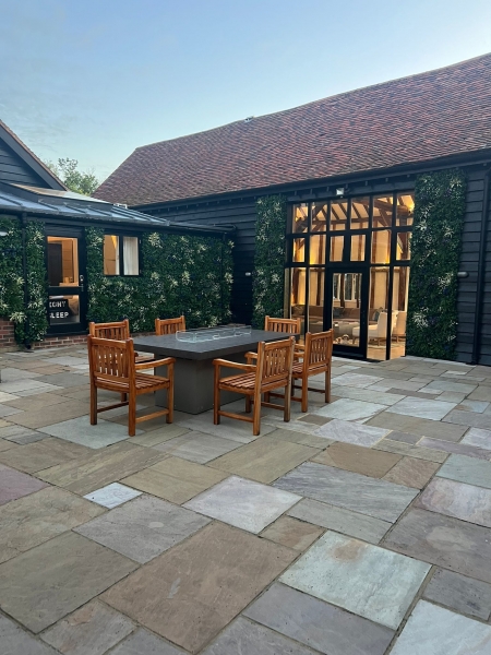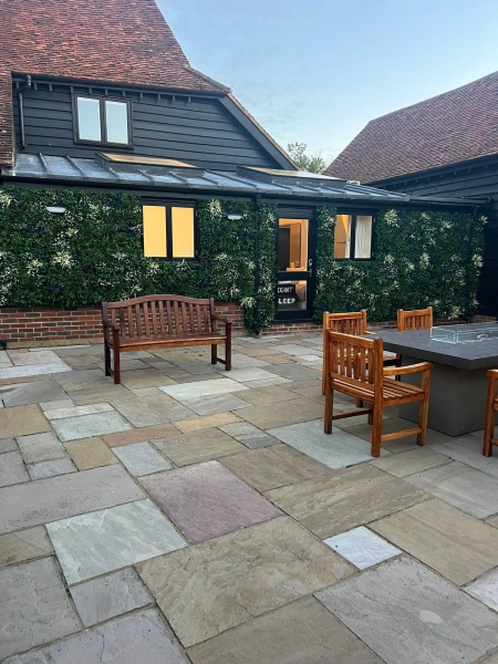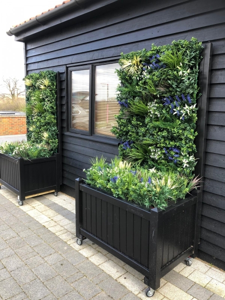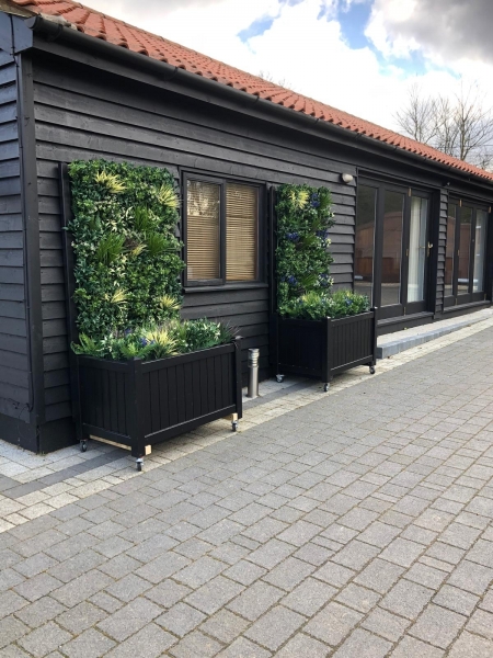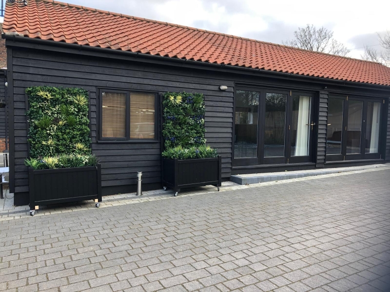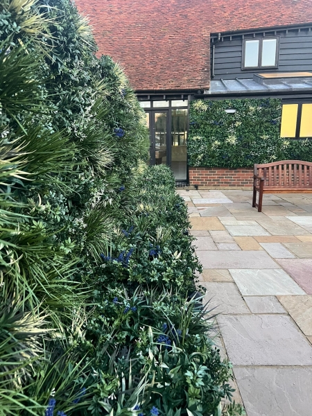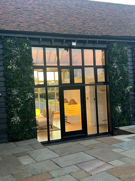 Our solution lay in the exceptional GE Milan artificial green wall panels. These panels are meticulously crafted to mimic the beauty of real foliage, offering an eye-catching alternative that requires minimal maintenance. The large window and door area were elegantly framed using the GE Milan panels, creating a seamless connection between the interior and exterior. To add a touch of colour, we strategically incorporated sprays of blue flowers within the lush foliage. Our team worked closely with the client to ensure that every element of the design complemented the barn's character. The result was a characterful green wall that not only fulfilled the brief but also became a conversation piece that breathed new life into the space.